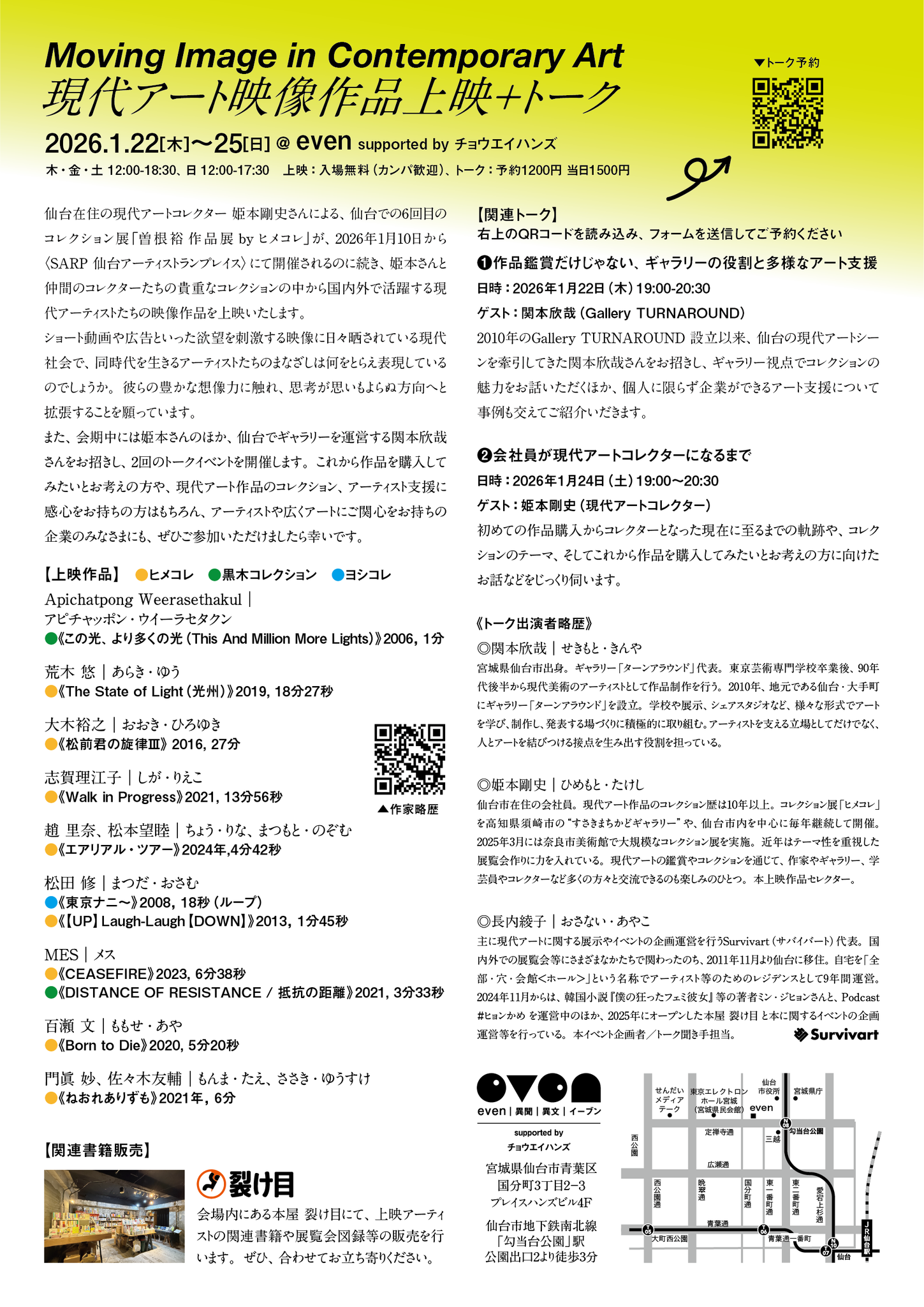仙台在住の現代アートコレクター 姫本剛史さんによる、仙台での6回目のコレクション展「曽根裕 作品展 by ヒメコレ」が、2026年1月10日から〈SARP 仙台アーティストランプレイス〉にて開催されるのに続き、姫本さんと仲間のコレクターたちの貴重なコレクションの中から国内外で活躍する現代アーティストたちの映像作品を上映いたします。