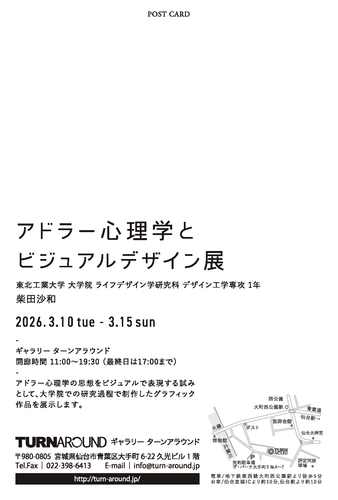 東北工業大学 デザイン工学専攻(社会価値創造分野)修士1年の柴田沙和さんによる修士研究「アドラー心理学に着目したビジュアル表現と空間インスタレーション」のデザイン成果展が開催されます。